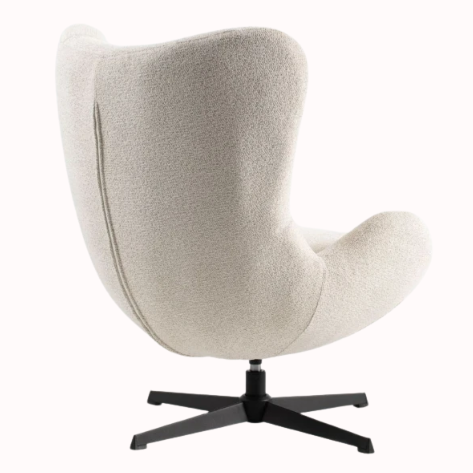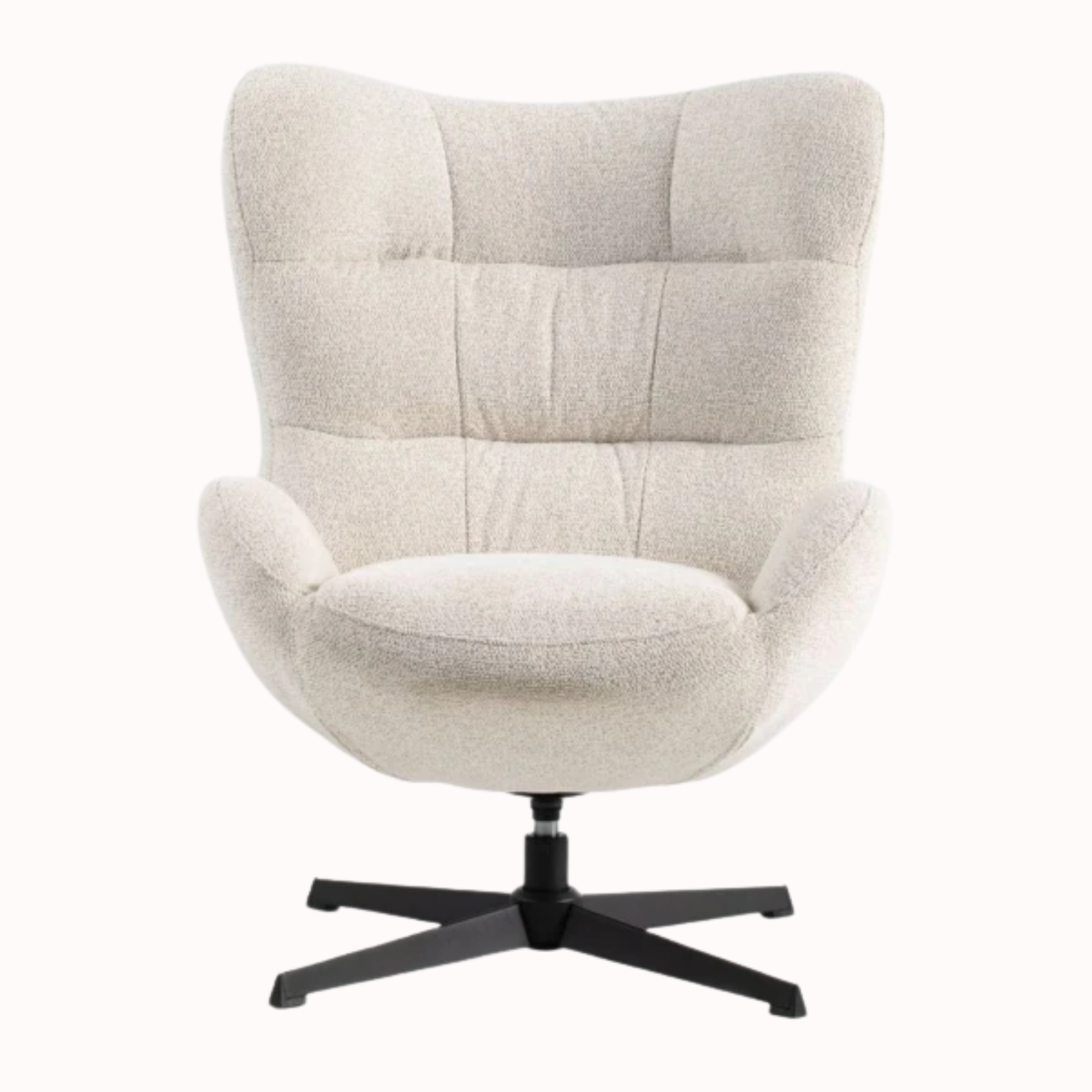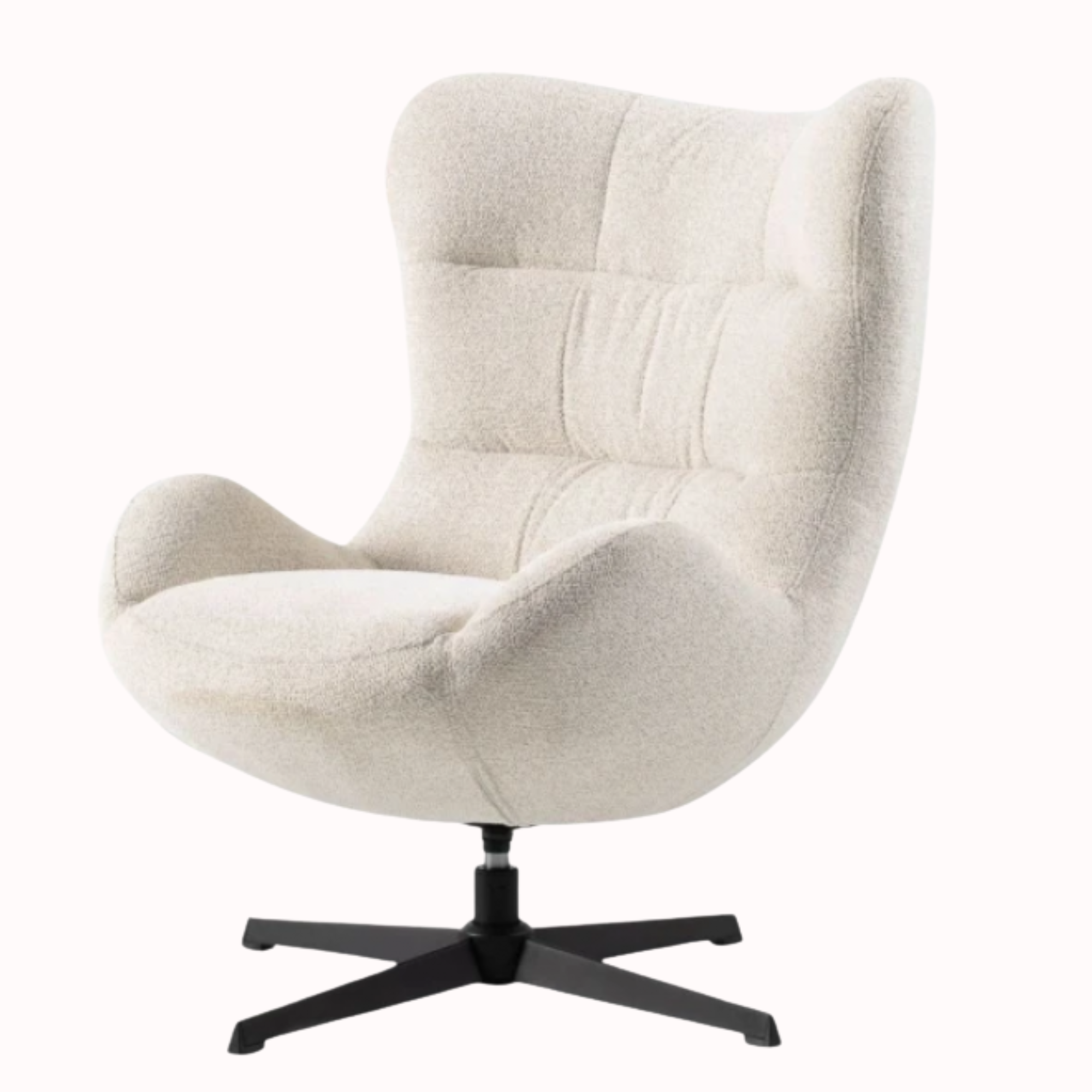 Butaca Bermeo, importada. Butaca giratoria tapizada en tela lavable, ultra cómoda y con diseño envolvente. Su base metálica negra aporta un toque moderno y elegante, ideal para living o rincón de lectura.