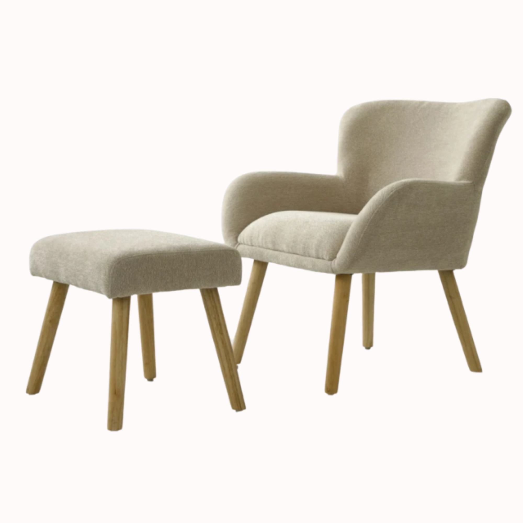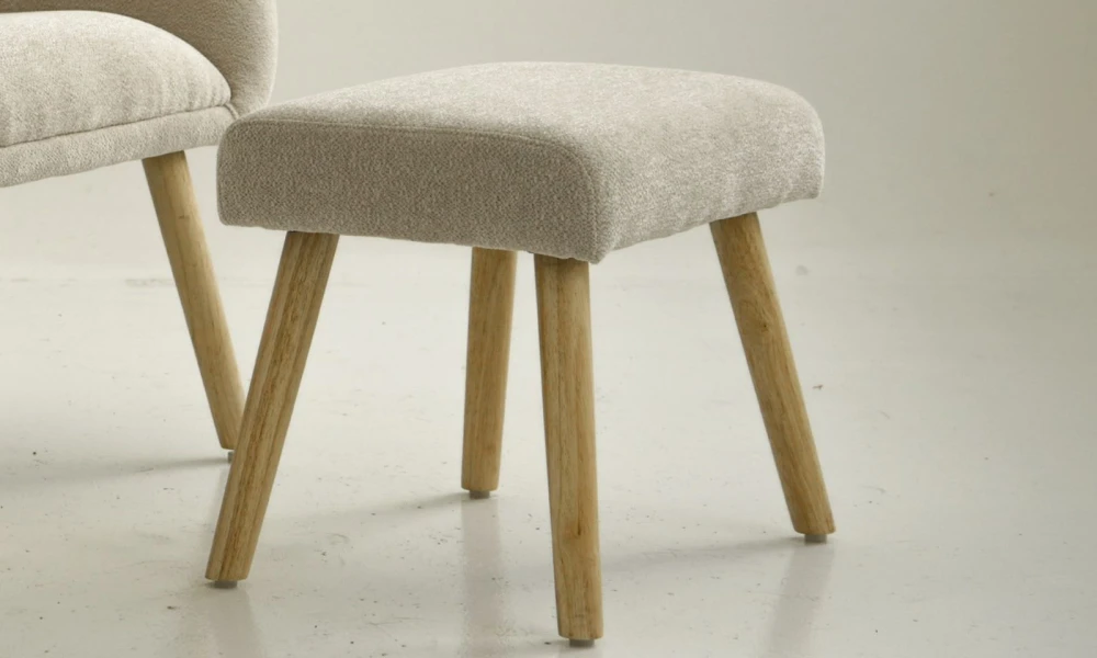 Butaca Moderna y practica incluye apoya pies a juego. Su tapizado en corderito ofrece una textura suave y cálida, mientras que la base de madera maciza en tono natural aporta un aire acogedor ideal para momentos de descanso.