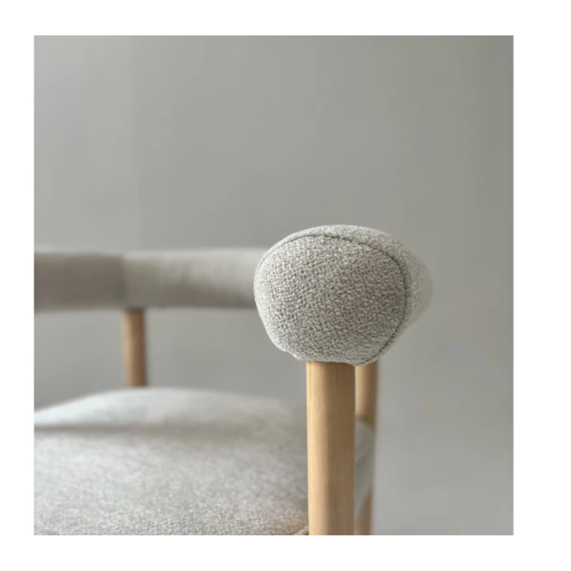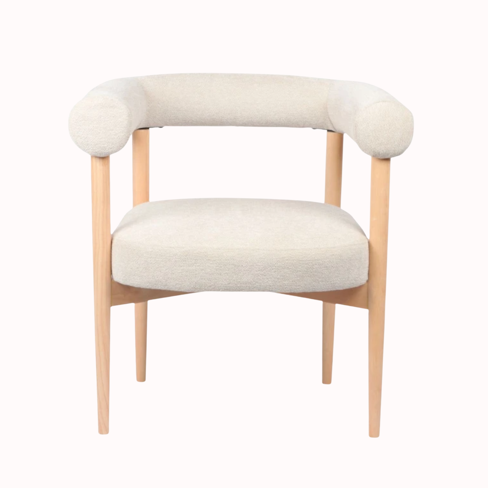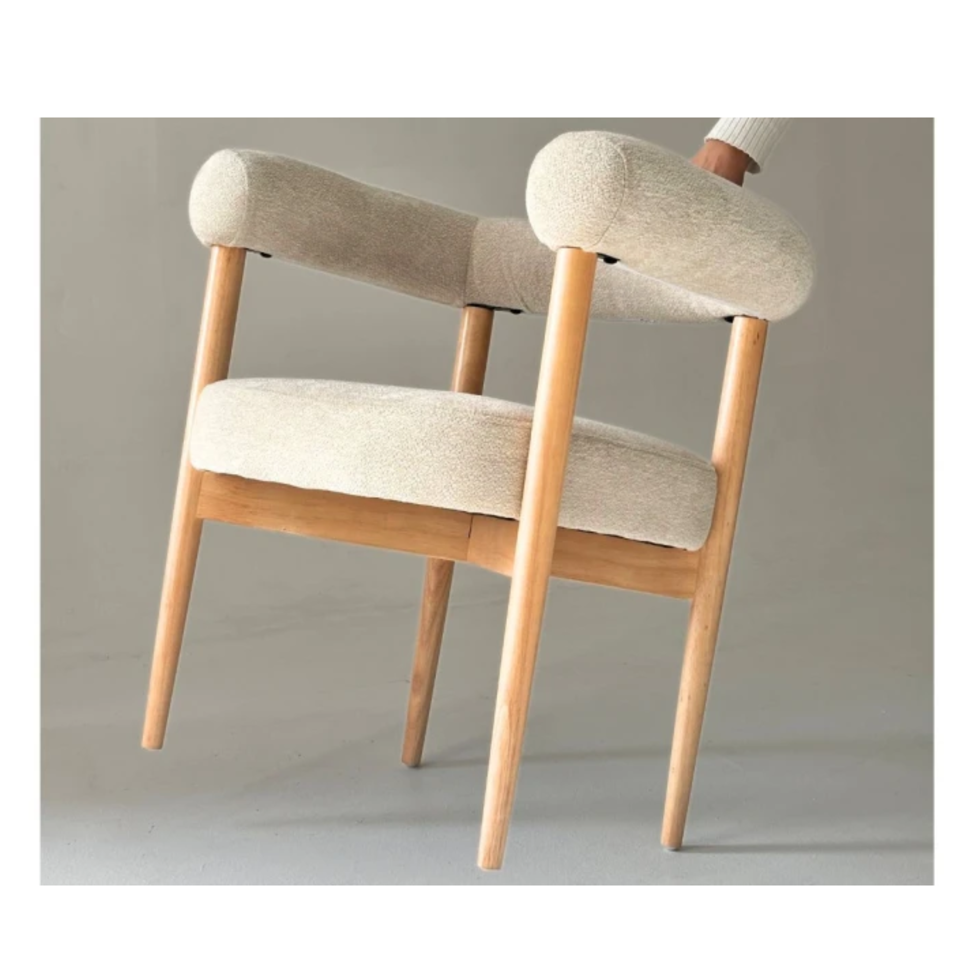 Butaca Olivia, importada. Una pieza elegante y cálida, tapizada en tela rústica beige que aporta textura y suavidad. Su estructura de madera en tono natural completa un diseño armonioso, ideal para realzar cualquier rincón del hogar.