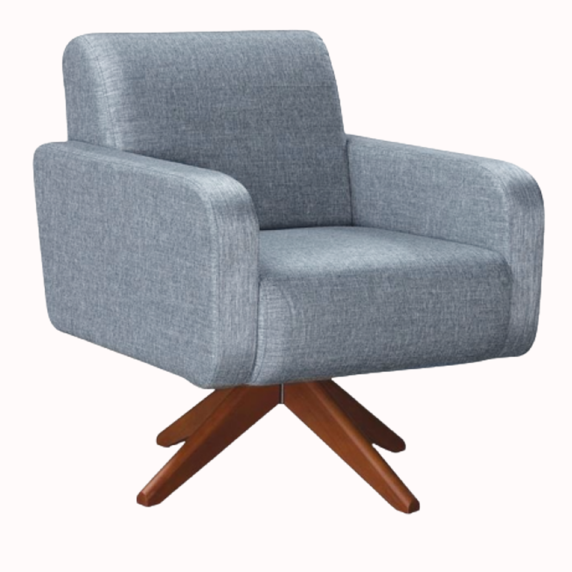 Butaca Giratoria Trento, importada. De diseño vintage, combina gran comodidad con estilo clásico. Su tapizado en tela y patas en madera maciza aportan calidez y solidez, ideal para living o espacios de lectura.