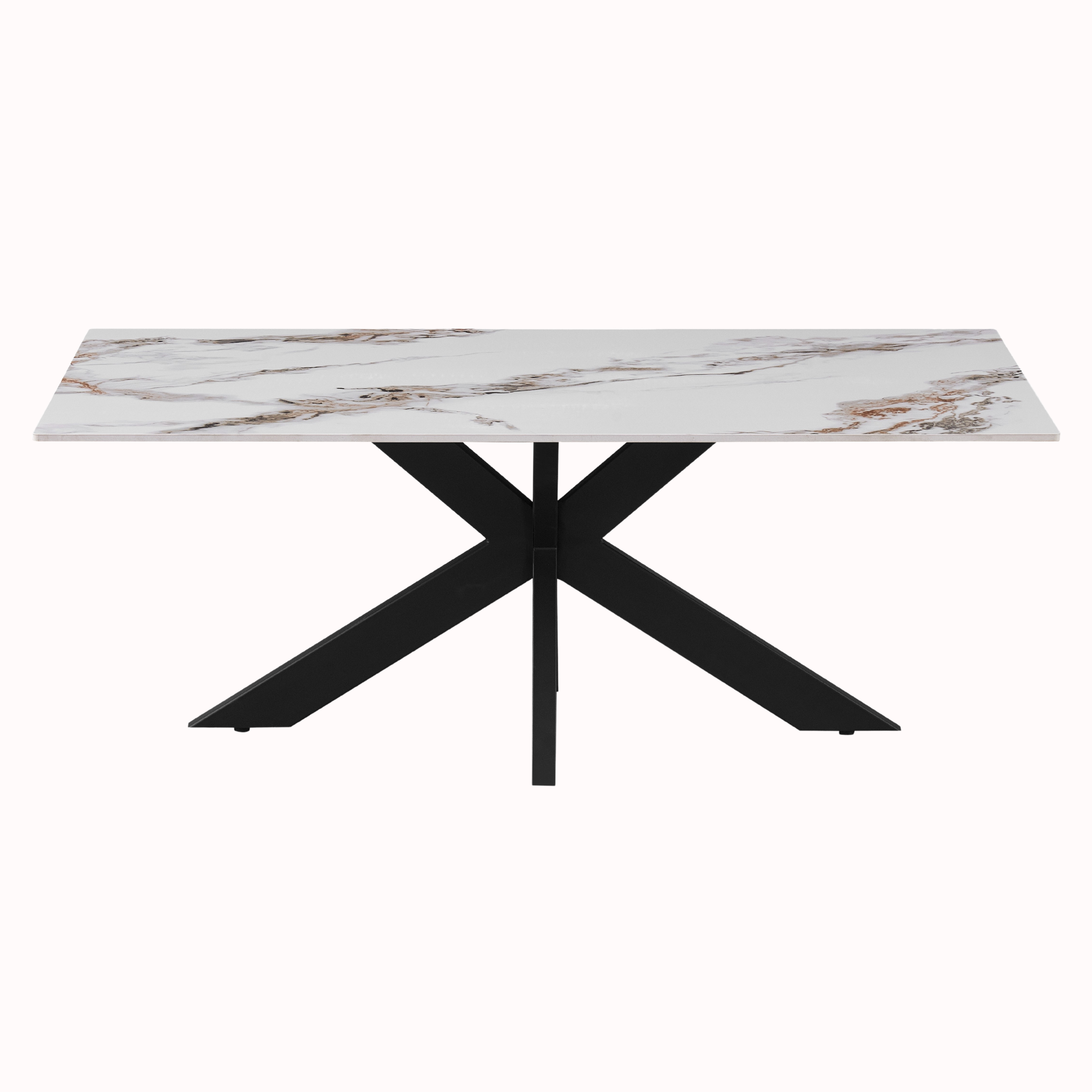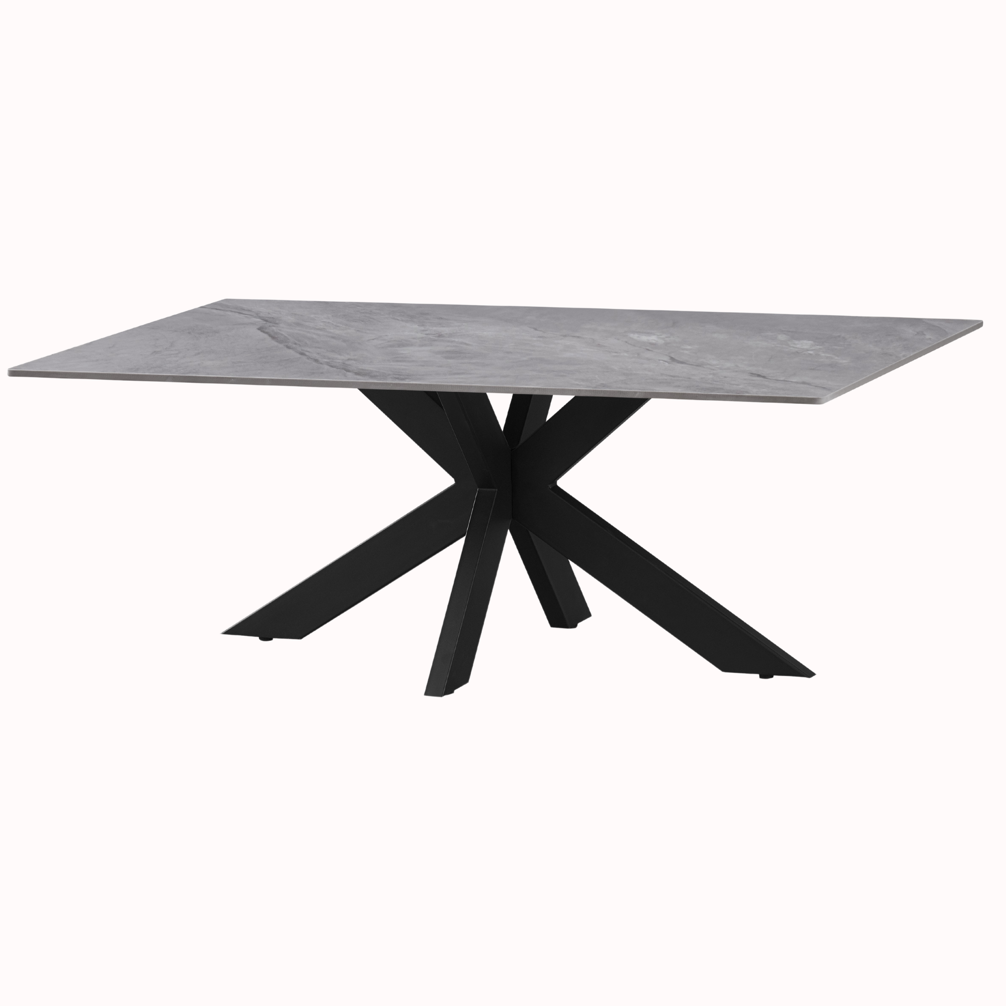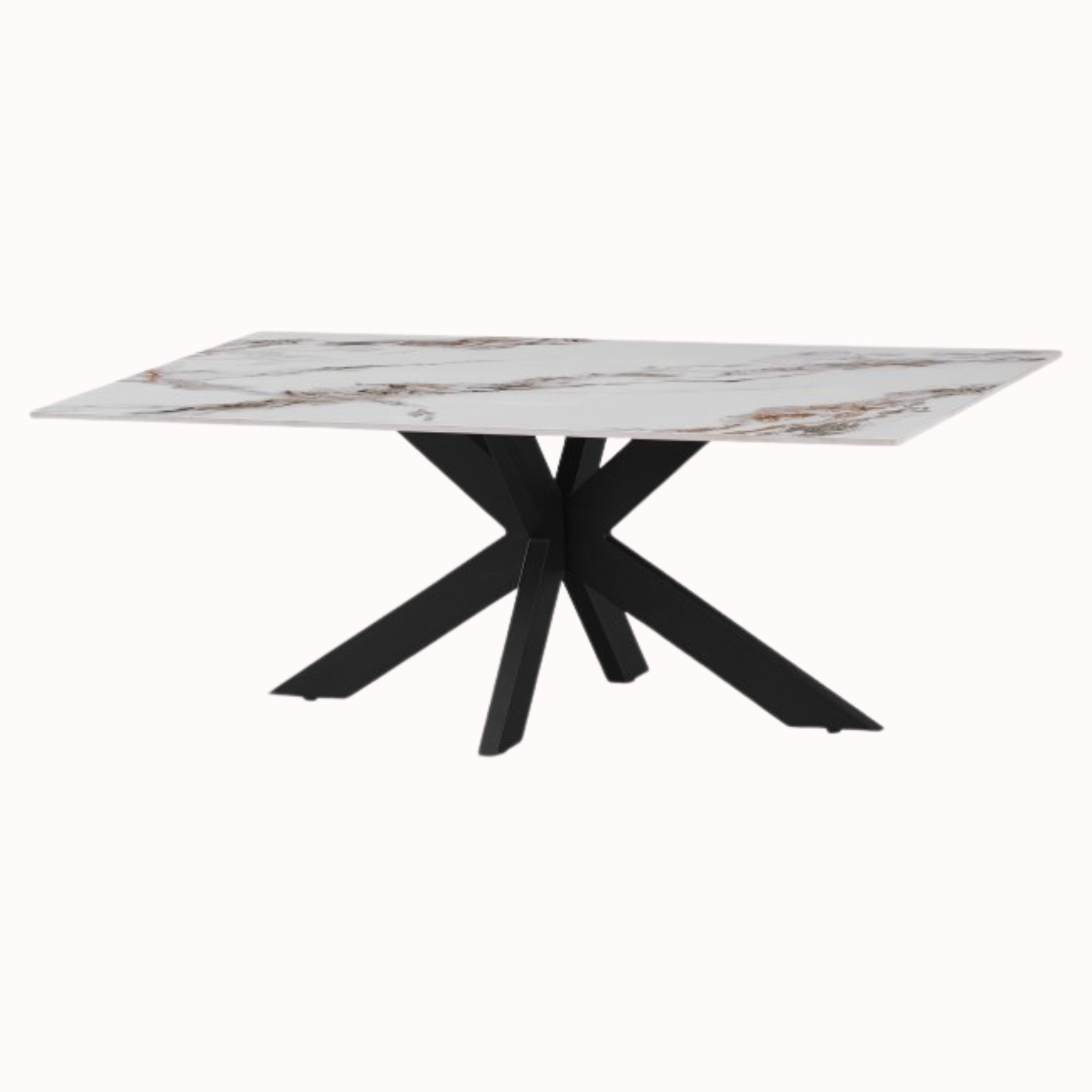 Mesa Centro Denver, cuyo diseño combina cerámica símil mármol y base de metal, convirtiéndola en la opción ideal para reuniones y eventos especiales.