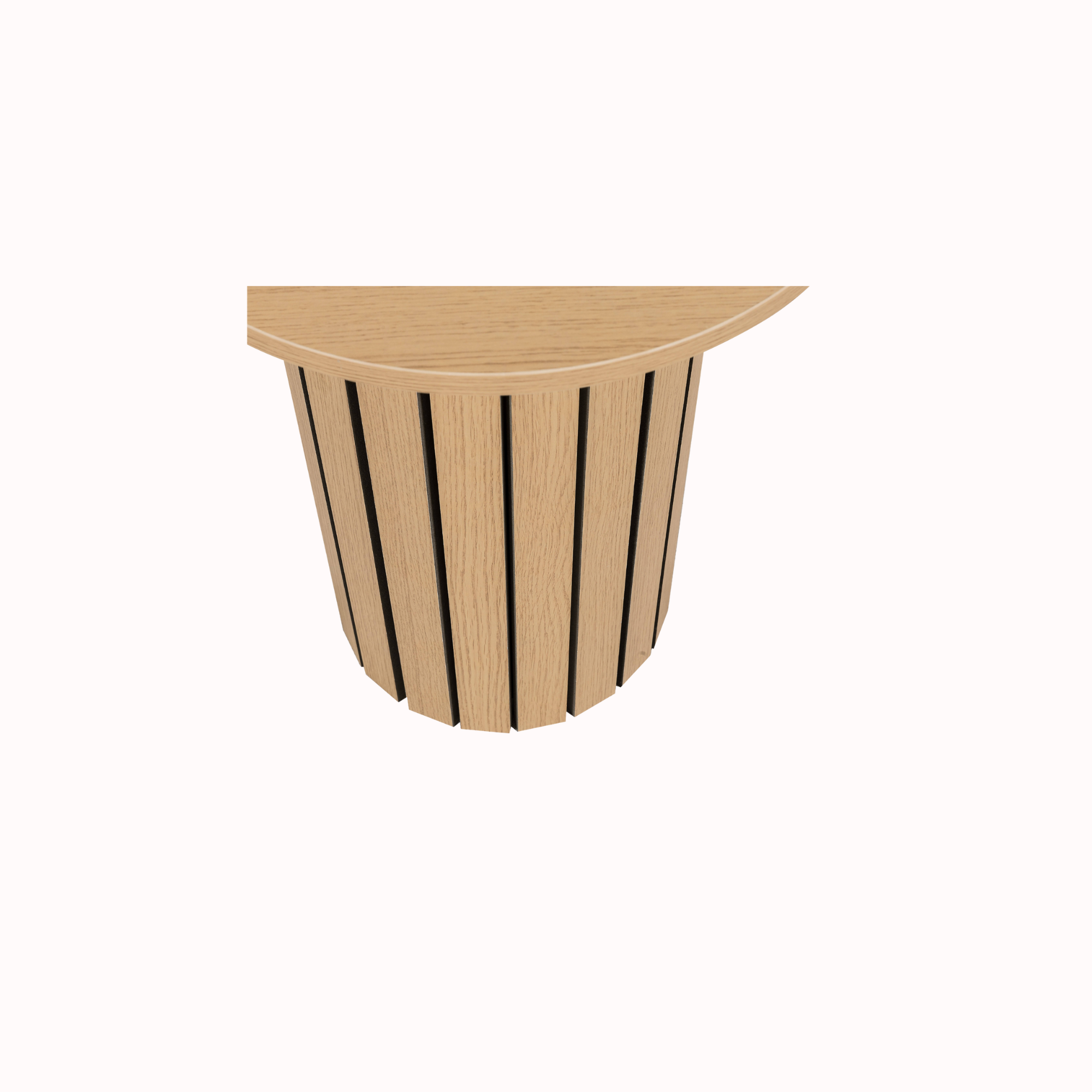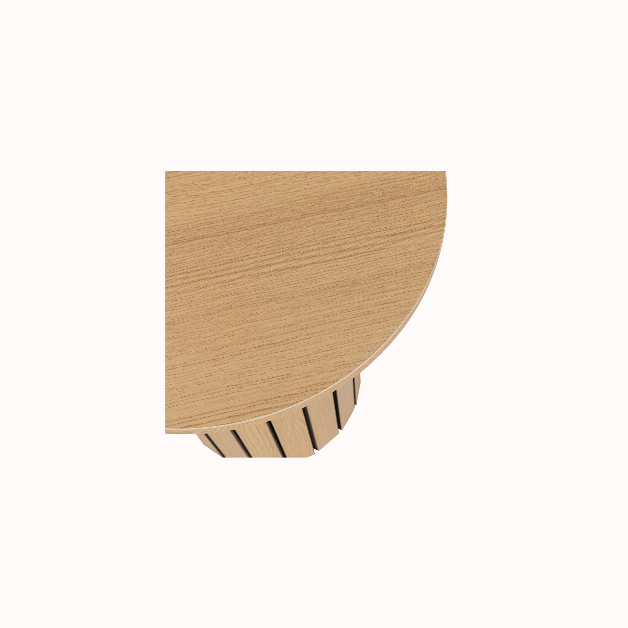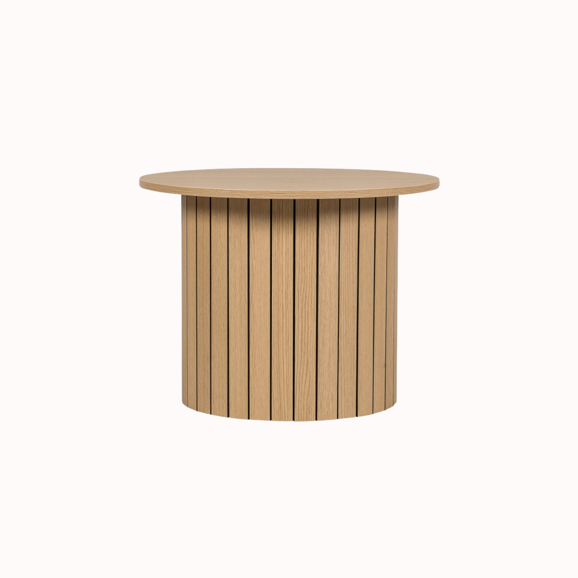 Mesa Centro Lagos, redonda y funcional, realizada en melamínico tipo roble.