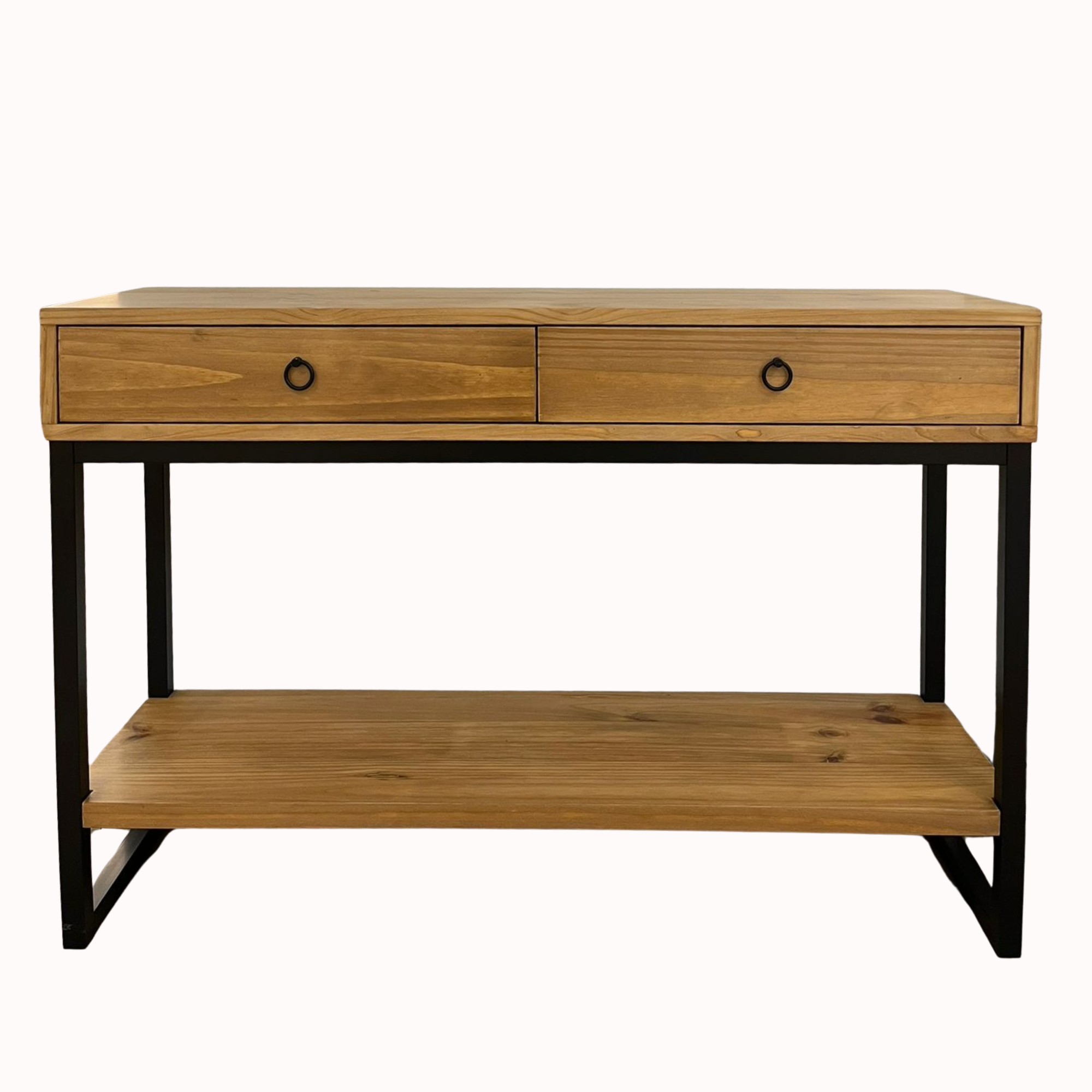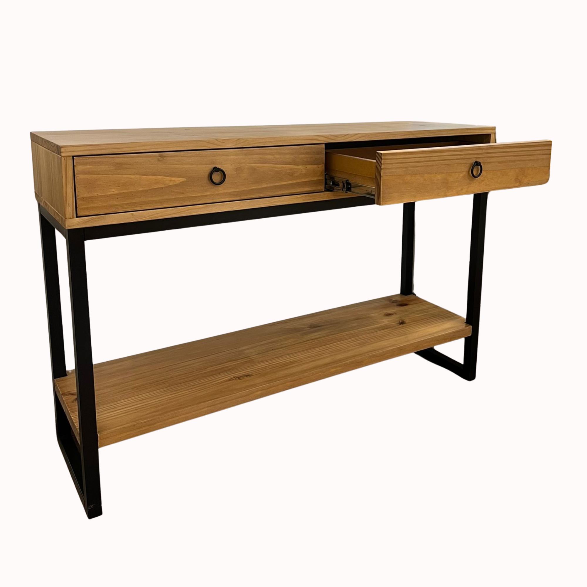Recibidor Industrial, de diseño moderno con toques rústicos, combina la calidez de la madera de pino con la solidez del hierro negro. Su estilo versátil y funcional lo convierte en una pieza ideal para complementar entradas, livings o pasillos.