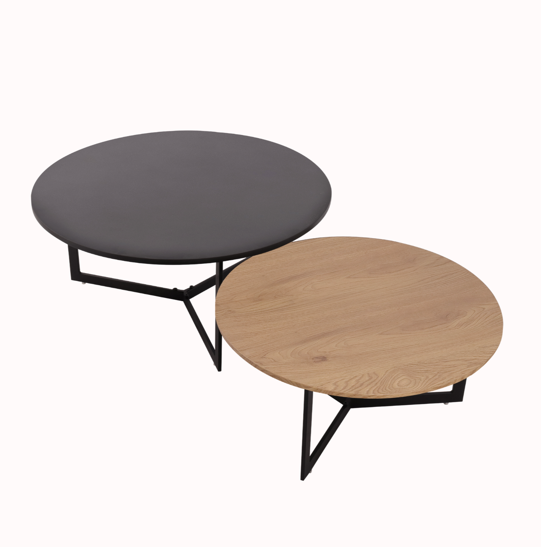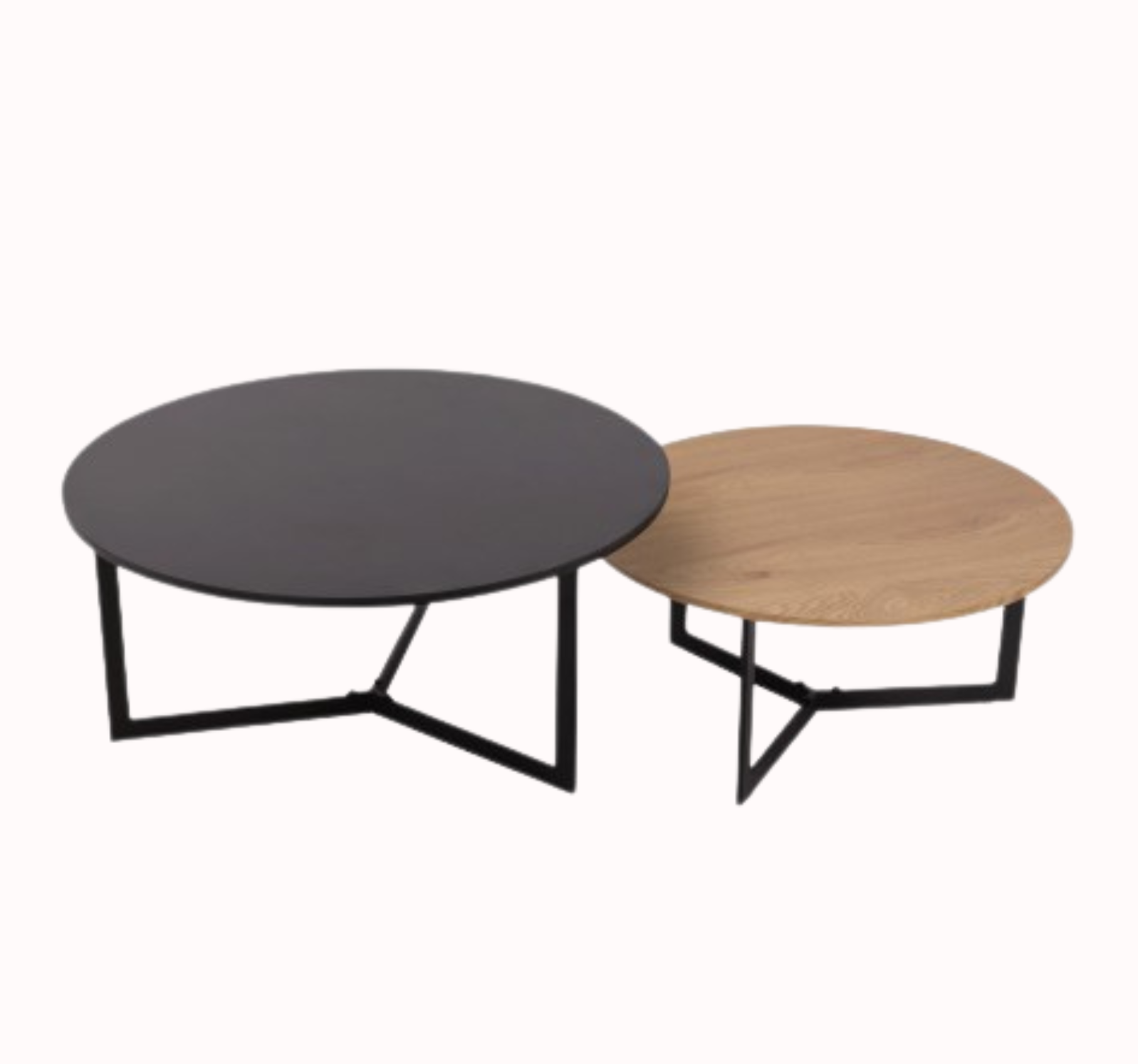 Set Mesas Berna, de diseño redondo, industrial y práctico. Su estilo moderno combina funcionalidad y estética, siendo una opción versátil para ambientar el living.