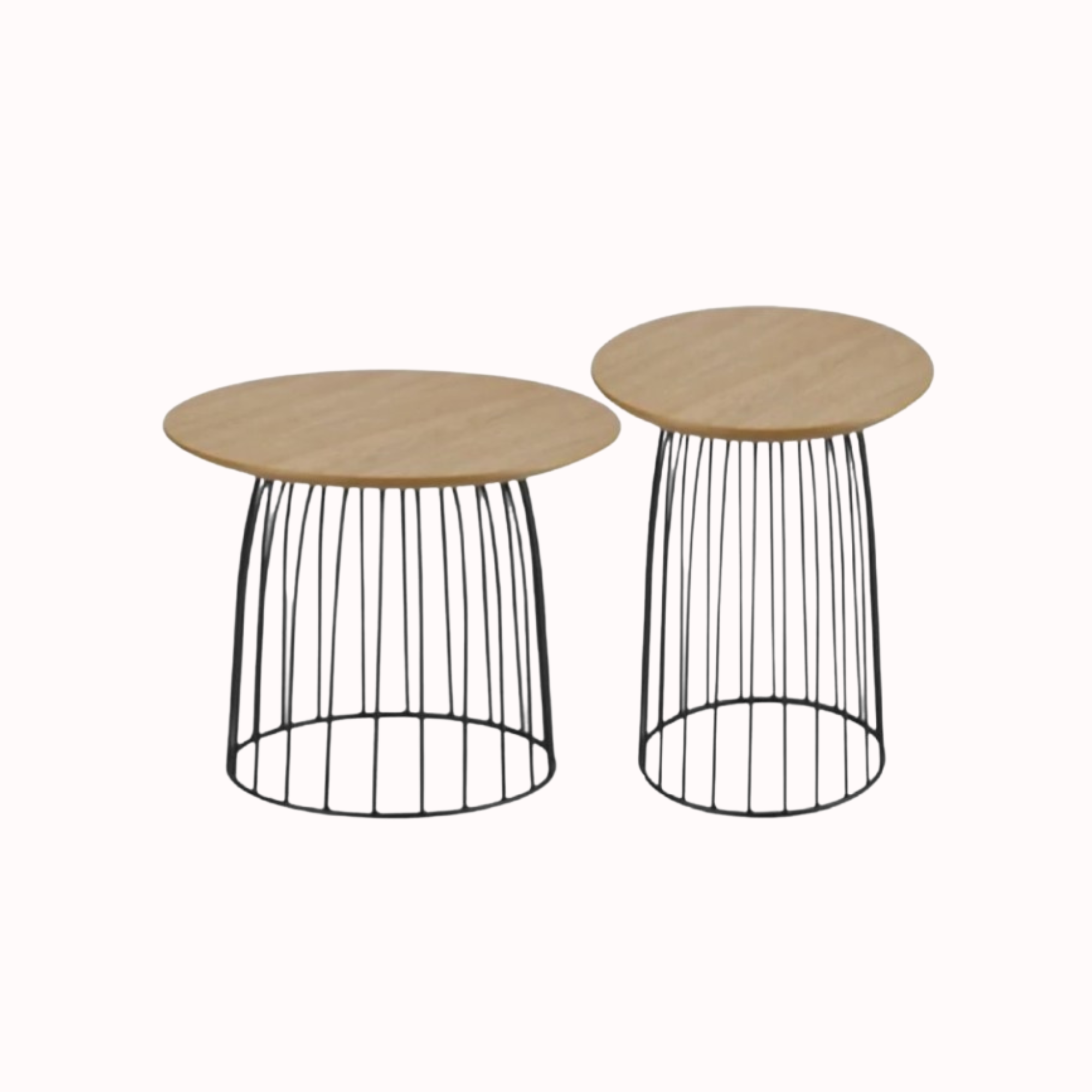 Set de Mesas Irlanda, de diseño industrial con patas de hierro y tapa en símil madera. Su estilo versátil y moderno las convierte en una opción práctica para ambientar el living.