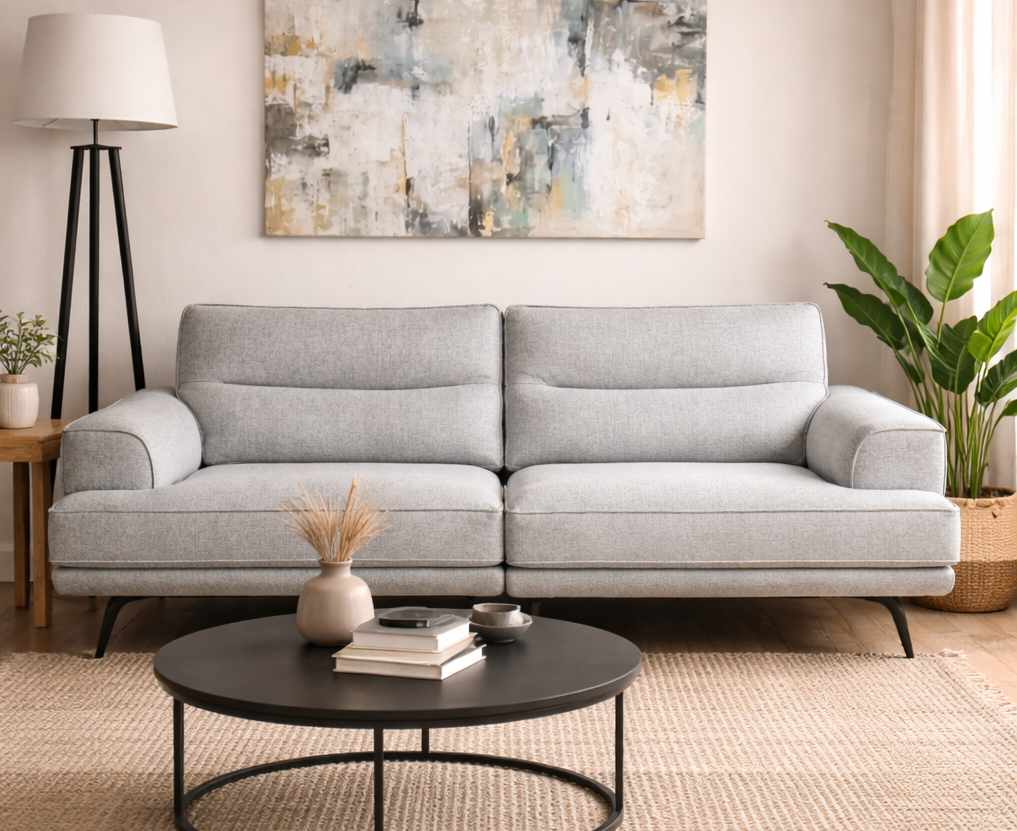 Sofá de 3 cuerpos con líneas modernas y respaldo con riñonera para mayor confort. Incorpora resortes zig-zag y plancha soft, brindando un asiento firme y confortable. Tapizado en tela rústica waterproof que repele líquidos y manchas, ideal para un uso diario sin preocupaciones.