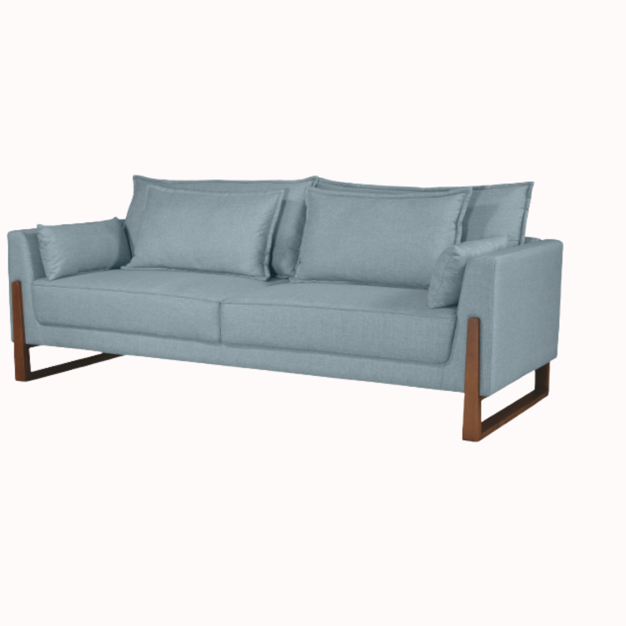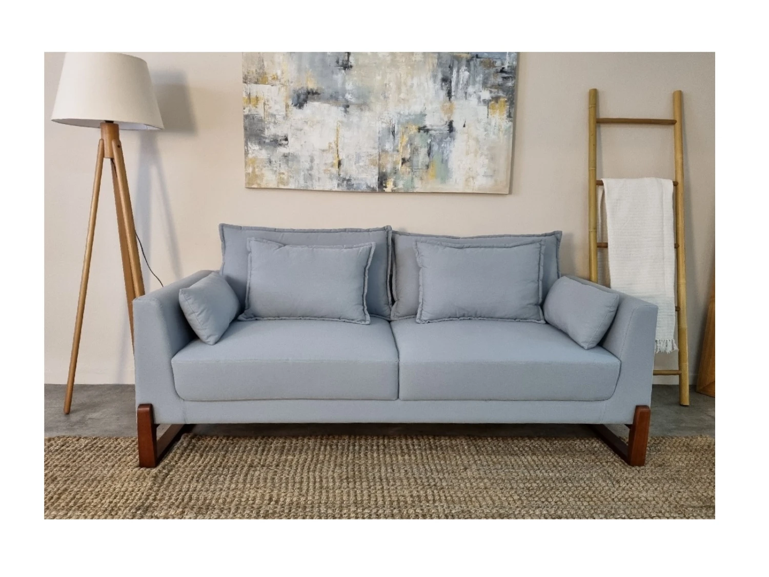 Sofá con base de madera maciza, almohadones sueltos de respaldo con pestañas decorativas y 2 almohadones de decoración, combinando confort y estilo.