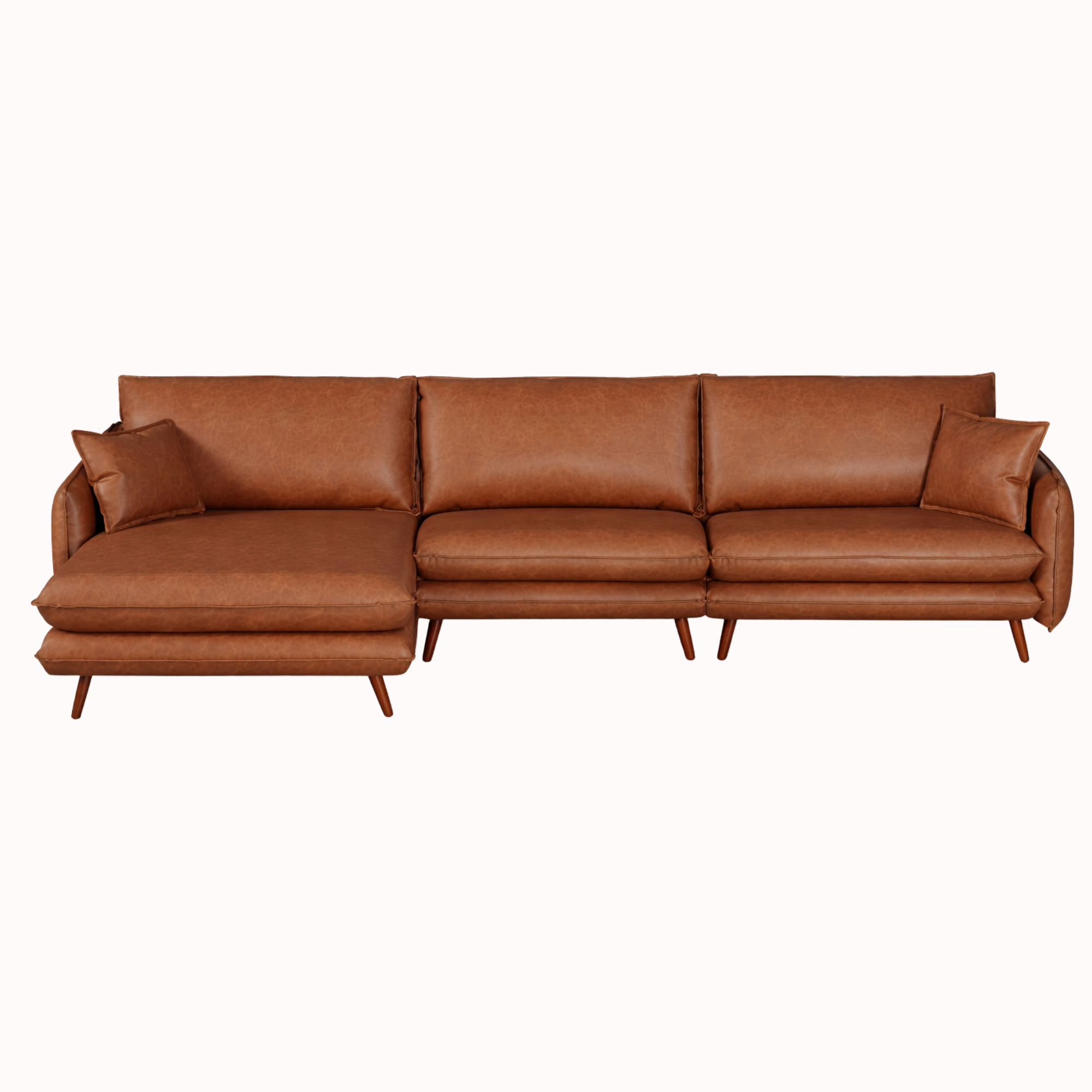 Sofá con chaise de diseño moderno, tapizado en PU Soft, un material resistente y de fácil limpieza. Sus asientos cuentan con plancha soft de alta densidad y resortes zig zag, y los respaldos rellenos con guata siliconada brindan comodidad y buen soporte, ideal para un uso diario.