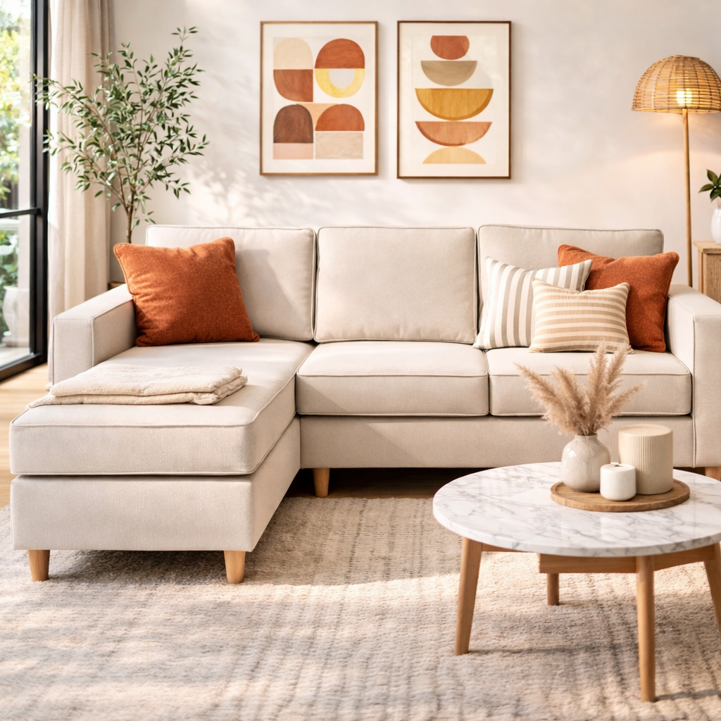 Sofá importado tipo chaise longue de líneas rectas, con patas de madera y almohadones desenfundables. Su diseño práctico permite colocar el módulo chaise tanto a la derecha como a la izquierda, adaptándose fácilmente a la distribución de cada espacio.