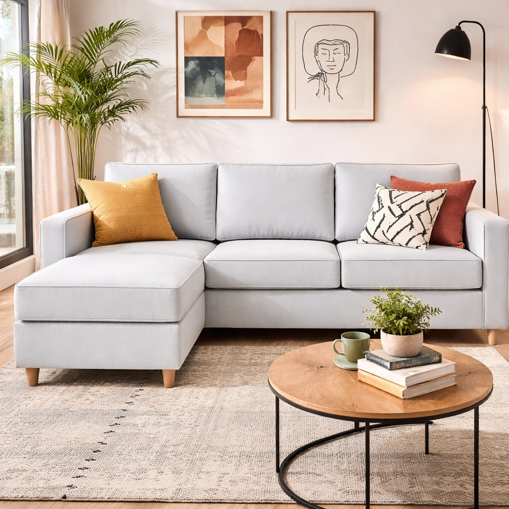 Sofá importado tipo chaise longue de líneas rectas, con patas de madera y almohadones desenfundables. Su diseño práctico permite colocar el módulo chaise tanto a la derecha como a la izquierda, adaptándose fácilmente a la distribución de cada espacio.