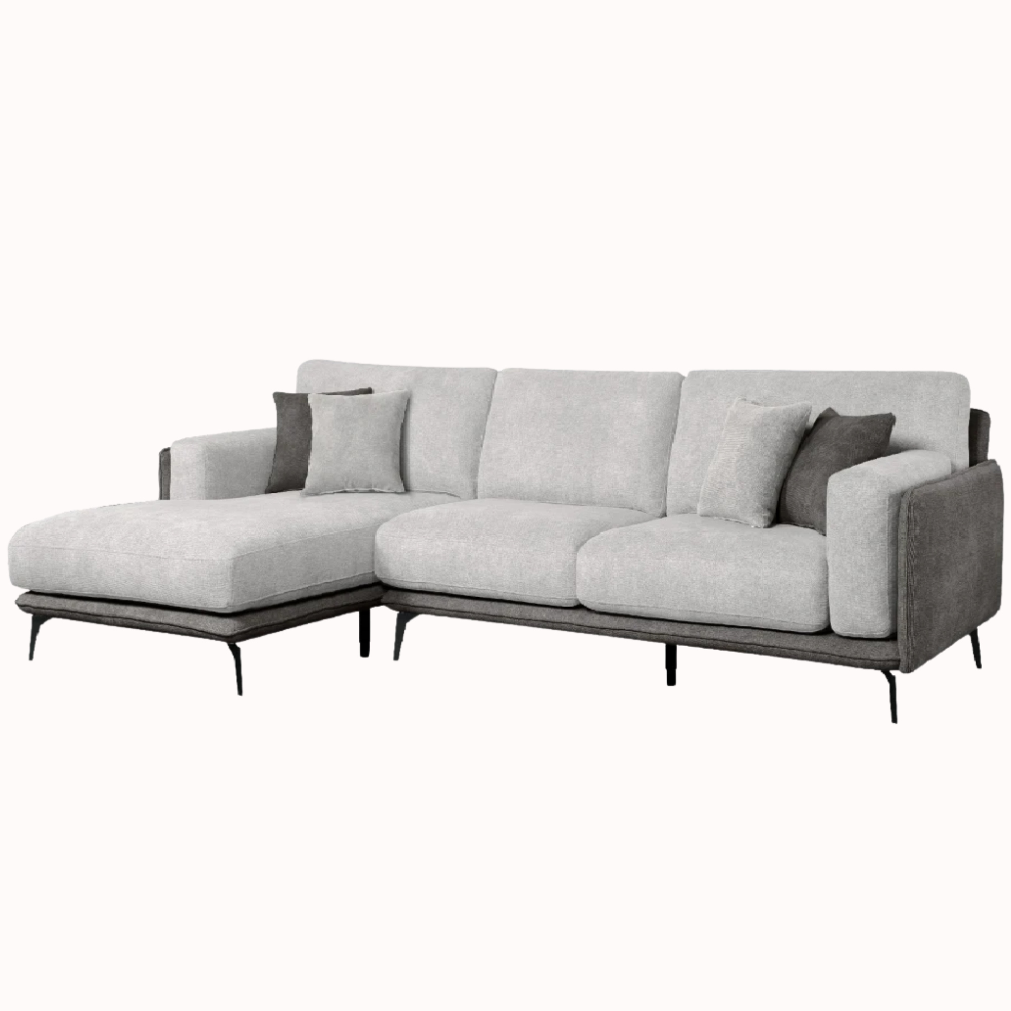 Este sofá Zambia combina amplitud, estilo y confort en una sola pieza. Con sus generosas dimensiones de 3.00 x 1.70 mts., ofrece espacio suficiente para toda la familia o para relajarte con total comodidad. Tapizado en una resistente tela rústica combinada en tonos neutros, aporta textura y carácter al ambiente, al tiempo que se adapta fácilmente a diferentes estilos decorativos. Su chaise integrado invita a estirarse y descansar, mientras que la estructura sólida y el acolchado firme garantizan durabilidad y soporte. Las patas metálicas estilizadas completan el diseño, aportando un toque contemporáneo y ligero.